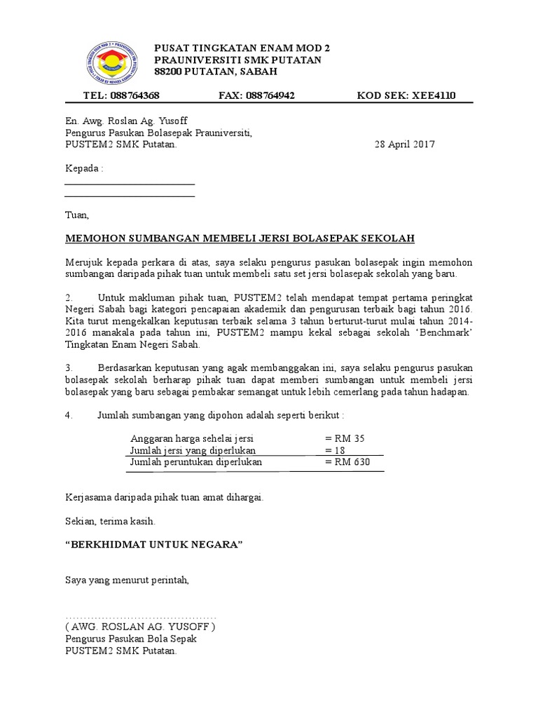 Ibu bapa penjaga murid SK Taman Bukit Kempas 81200 Johor Bahru Johor. Surat Sumbangan Peralatan Sukan Pdf. Kumpulan Contoh Surat Permohonan Sumbangan Hari Raya yang Baik 2019.